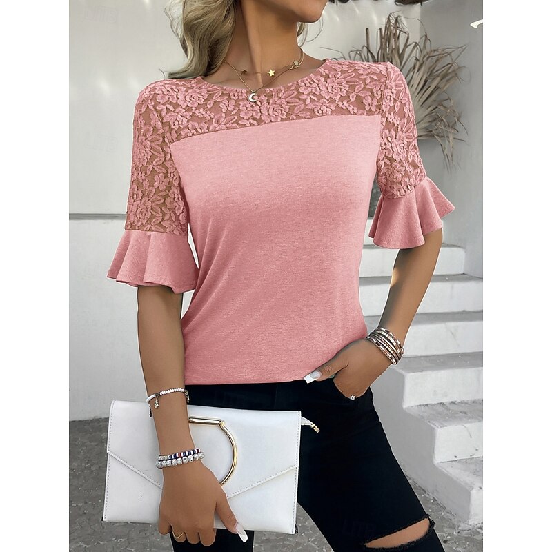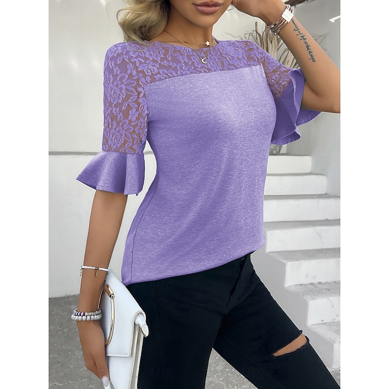 More information about Women's Lace Shirt Solid Color Stylish Casual Half Sleeve Crew Neck Regular Tops Daily Lace Patchwork Black Pink Purple Green Summer