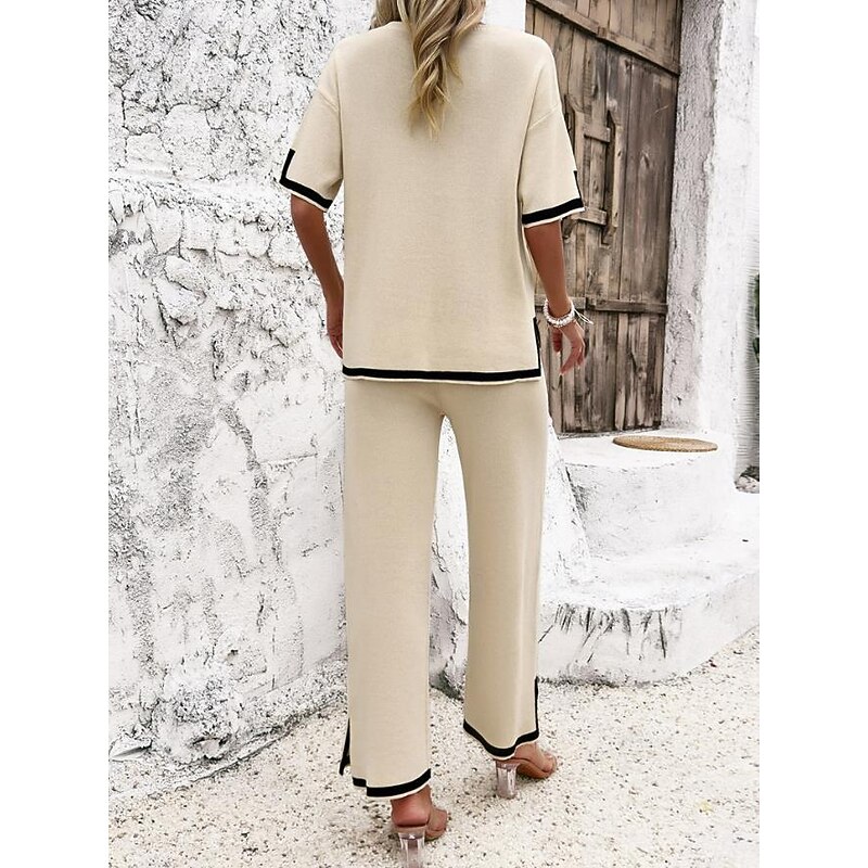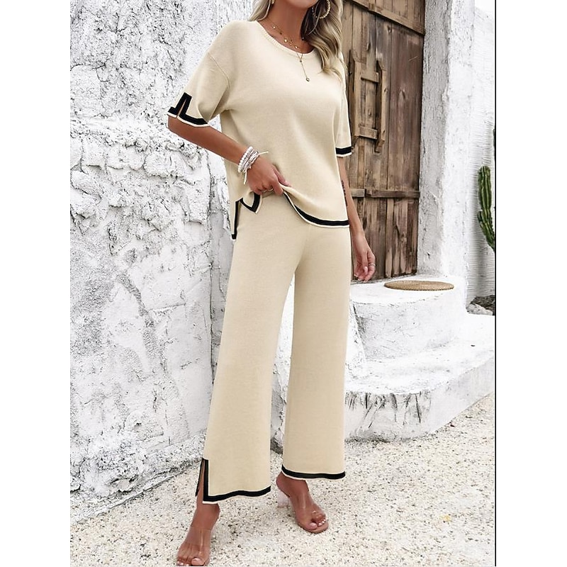 Highlights [Fabric] : Crafted from a high-quality polyester blend, this two-piece set offers enhanced stretch and durability, ensuring both comfort and longevity. The soft fabric provides a lightweight feel, perfect for warm summer days. [Fit] : Designed in a loose fit, the outfit includes a relaxed short-sleeve top with a crew neck, and wide-leg pants, both allowing for ease of movement and comfort. The tailored design of the pants contributes to a chic and flowing silhouette. [Design Highlights] : The ensemble features a stylish contrasting dark trim along the sleeves and hemline of the top and the hem of the pants, adding a touch of sophistication to the overall look. This detail creates a cohesive and polished appearance, ideal for fashion-forward individuals. [Occasions] : Perfect for daily casual outings or relaxed lounging at home, this set combines elegance with casual comfort. The neutral beige color gives it versatility, making it easy to accessorize for various looks. [Size Range] : Available in sizes S, M, L, and XL, the outfit offers a range of options to accommodate different body types, ensuring a flattering fit for everyone.