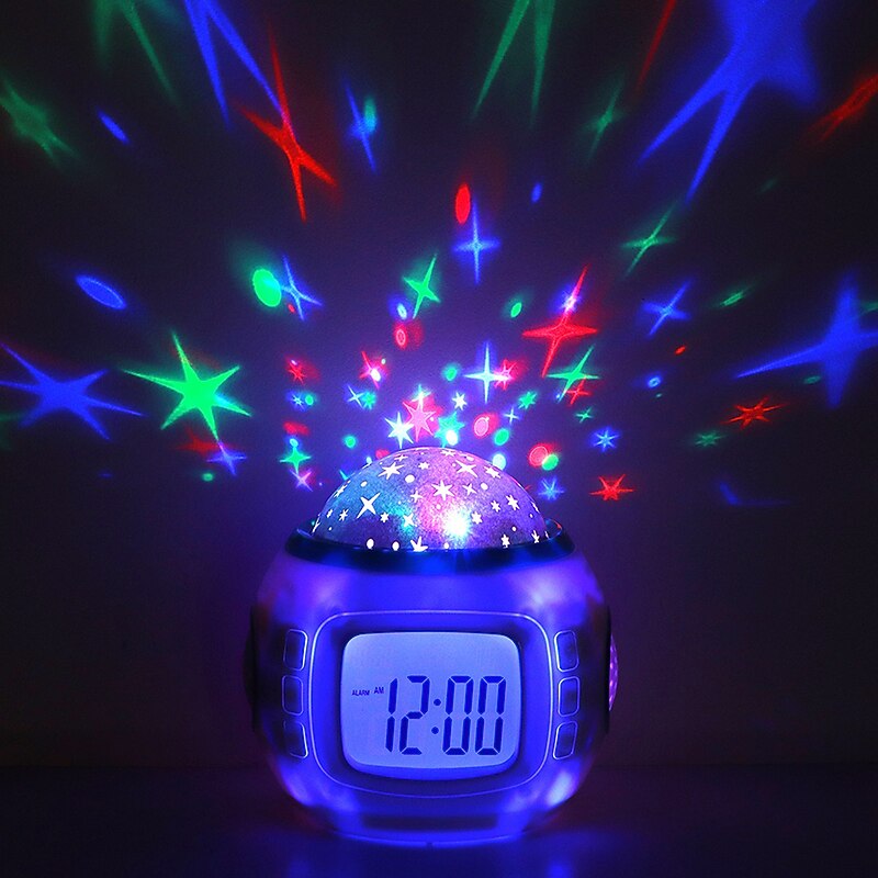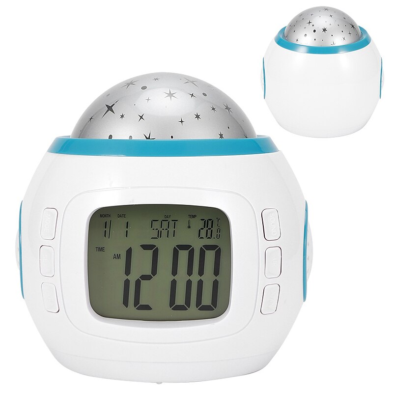 Highlights Product Selling Points: 1. Display calendar, time, date, week, and temperature in a 12-hour or 24-hour format. Offers Celsius/Fahrenheit conversion for the thermometer. 2. Two alarm options - chord music and natural sound. Includes stop alarm and countdown functions. 3. Features music appreciation mode with ten background music options. Colorful star projection enhances the rhythm of the music and provides backlighting. 4. Versatile design allows you to place it in any room, such as a studying room, bedroom, or desk. 5. Makes a beautiful gift idea, particularly for babies, children, girls, and women. 6. Compact size: Approx. 10.5x10.5x8.5cm / 4.1x4.1x3.3in 7. Lightweight: Approx. 159g/5.6oz 8. Battery operated: Requires 3 x AAA batteries (Not included) 9. Package includes: 1 x Projection Alarm Clock (Battery Not Included), 1 x Instruction Manual 10. Note: Please allow 1-2cm measurement error. The item color displayed in photos may slightly differ from the real object due to monitor calibration.