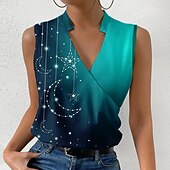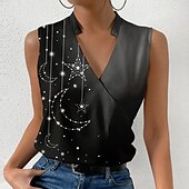 Highlights [Fabric] This women's tank top is made from lightweight polyester, providing a silky feel and micro-elastic fit, perfect for keeping cool and stylish during the summer months. [Silhouette] The regular fit and sleeveless design offer a relaxed yet flattering look, suitable for various body types, ensuring comfort without compromising on style. [Design Highlights] Featuring a vibrant galaxy print with celestial stars and crescent moons, this top is both whimsical and fashionable. The wrap-style V-neckline adds a touch of elegance, making it a standout piece in your wardrobe. [Occasions] This versatile tank top is ideal for casual settings or semi-formal occasions. Pair it with jeans for a laid-back look, or a skirt for a more polished ensemble, perfect for day outings or evening gatherings. [Size Range] Available in sizes S, M, L, XL, and 2XL, this tank top accommodates a broad range of sizes, ensuring a great fit for many body types.