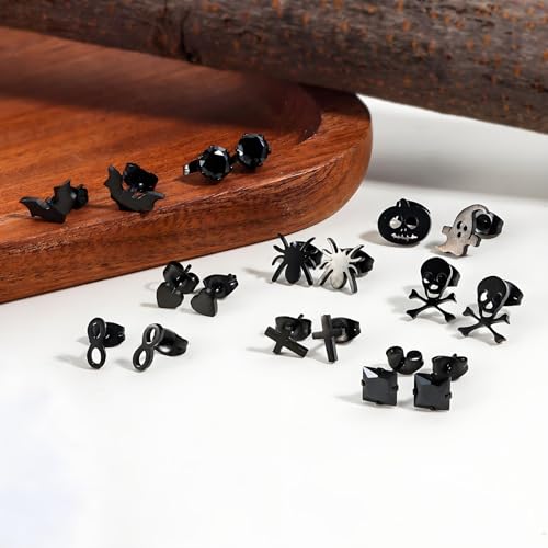 9 Pairs Stud Earrings Set Hypoallergenic black stainless steel cartilage stacked small earrings Halloween 5