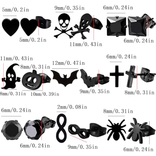 9 Pairs Stud Earrings Set Hypoallergenic black stainless steel cartilage stacked small earrings Halloween 4