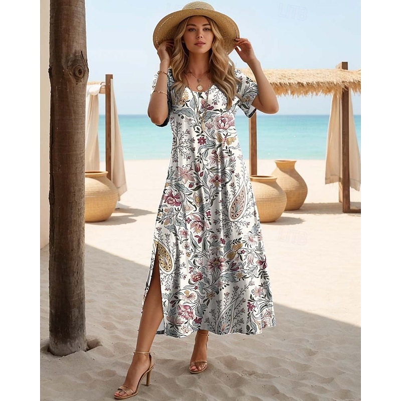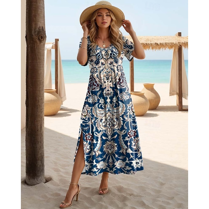 More information about Women's Maxi Dress Casual Dress T Shirt Dress Tee Dress Sundress Bohemia Date Regular Fit Geometric Short Sleeve Crew Neck Black Red Blue Dusty Blue Summer