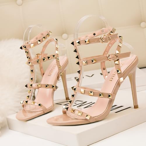 HOT ! Women's Studded Strappy Leather Stiletto Heels Sandals with Adjustable Ankle Buckle Sexy Open Pointed Toe Fashion T-Strap Roman High Heel Pumps for Party Prom Dress Shoes