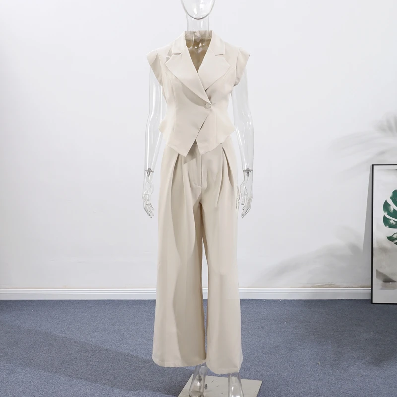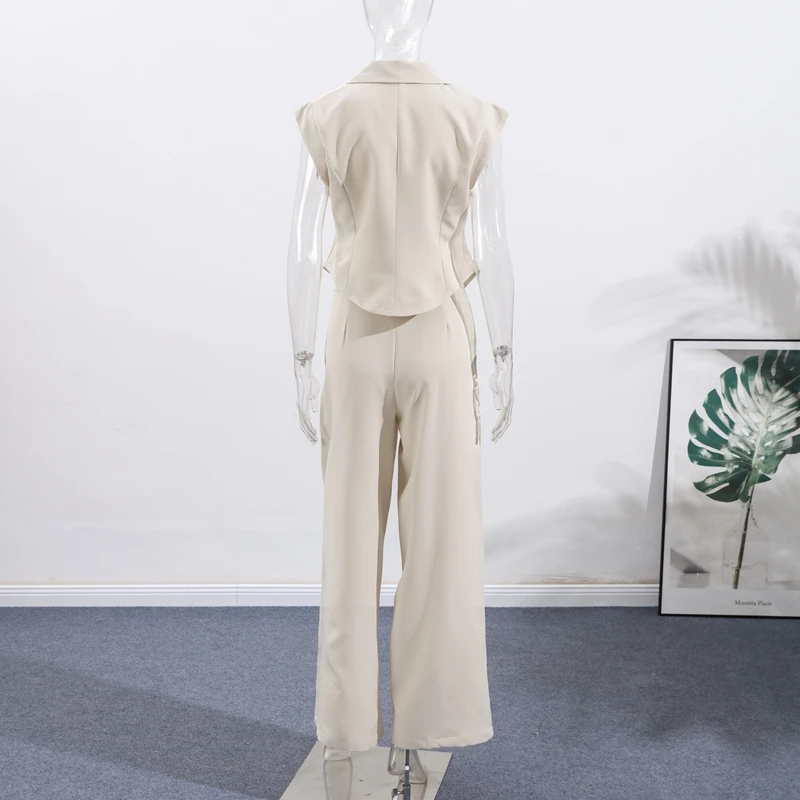 Vintage Top Pant Suit For Women Lapel Sleeveless V-neck Slimming Tops Loose Pocket Breasted Pants 2025 New Summer Commuter Sets