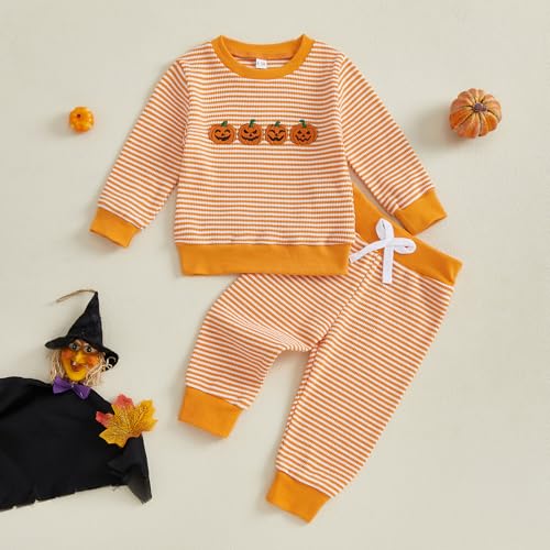 HOT ! Toddler Baby Boy Girl Halloween Outfit Pumpkin Ghost Embroidery Striped Waffle Sweatshirt and Pants Set Fall Clothes