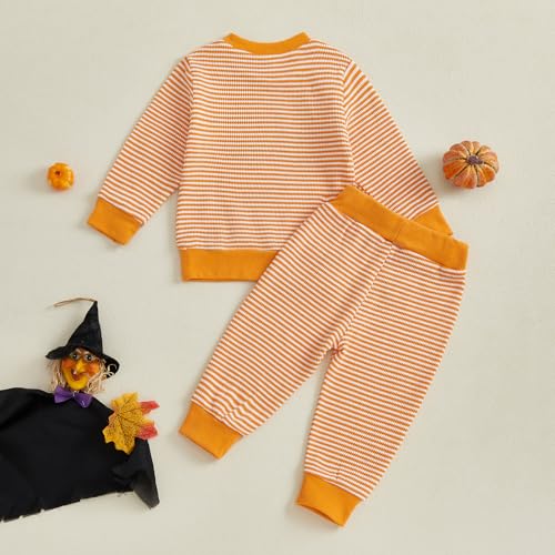 Toddler Baby Boy Girl Halloween Outfit Pumpkin Ghost Embroidery Striped Waffle Sweatshirt and Pants Set Fall Clothes 6