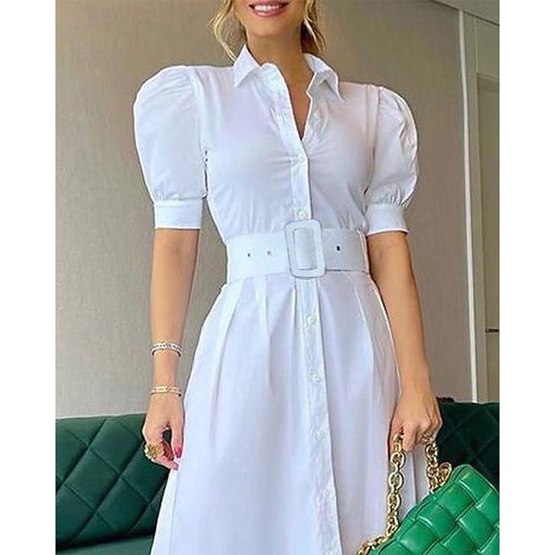 Highlights - Perfect for spring and summer - Made of comfortable polyester fabric - Short sleeves for a chic look - Designed for women - Stylish and casual - Ideal for date nights, vacations, and daily wear - Shirt dress style with button details - Features a classic lapel neckline