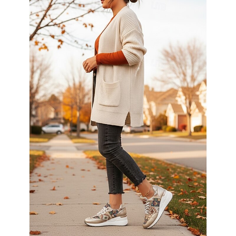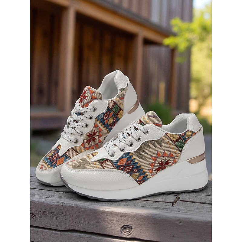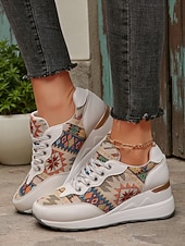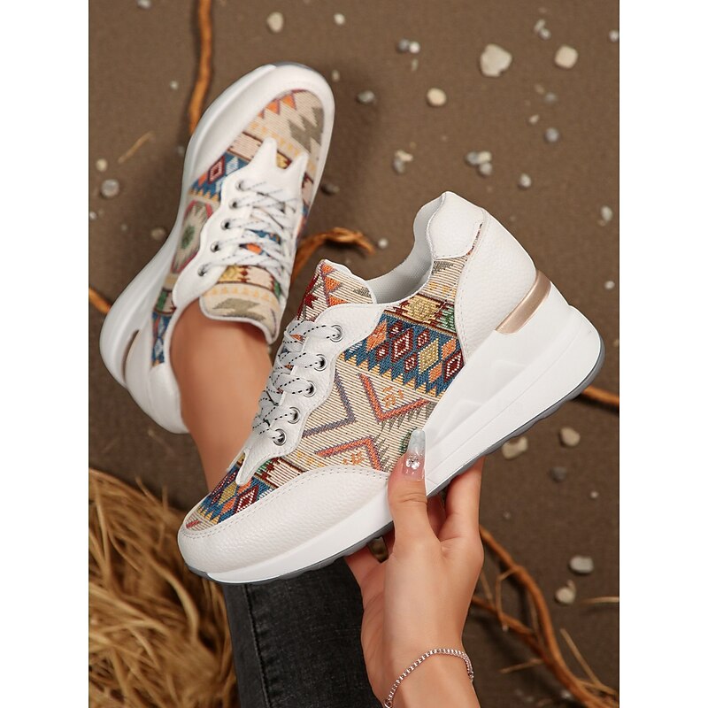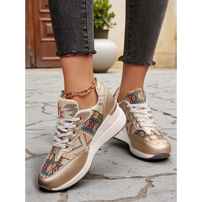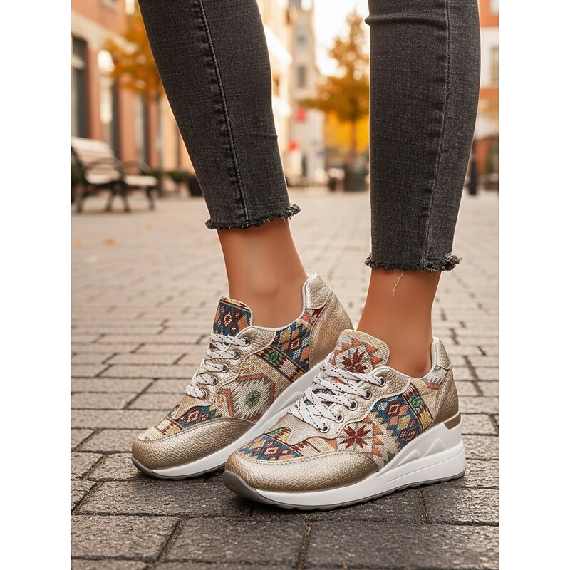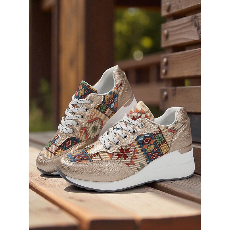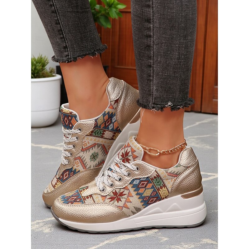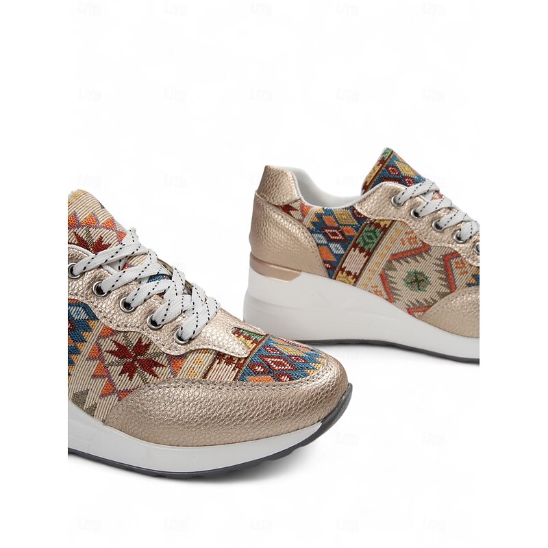 HOT ! Women's Gold Wedge Sneakers – Lace-Up Platform Trainers with Ethnic Print for Casual Streetwear and Weekend Travel