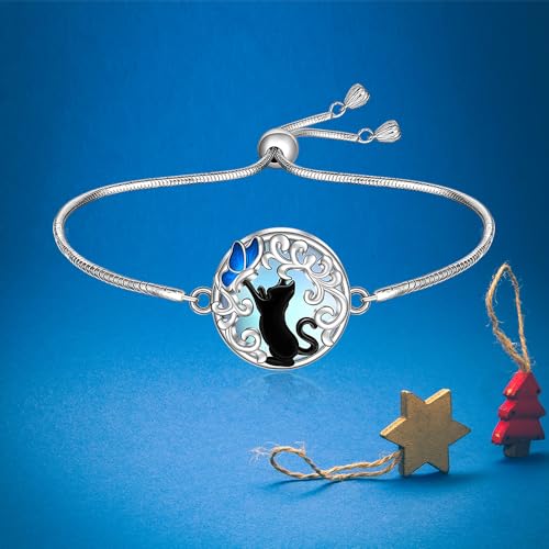 Black Cat Bracelet Filigree Moonstone Filigree Butterfly Cat Bracelets for Women Sterling Silver Halloween Cats Lover Gifts 7