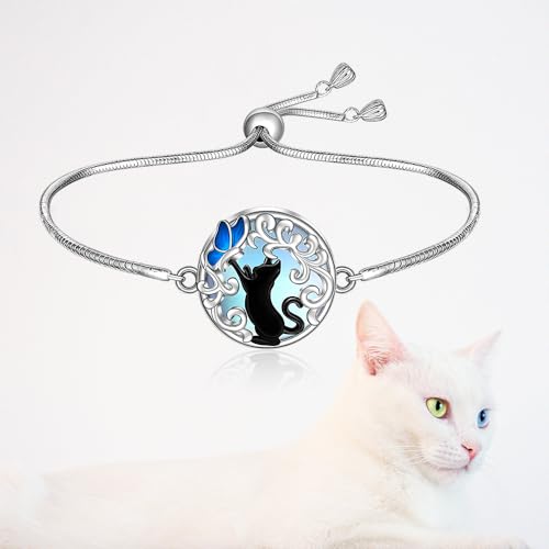 HOT ! Black Cat Bracelet Filigree Moonstone Filigree Butterfly Cat Bracelets for Women Sterling Silver Halloween Cats Lover Gifts