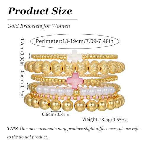 HUASAI Gold Beaded Bracelet Stack for Women Trendy Non Tarnish Chunky Stretch Paperclip Cross Pearl Bracelets Set Stackable Jewelry Costume Accessories 5