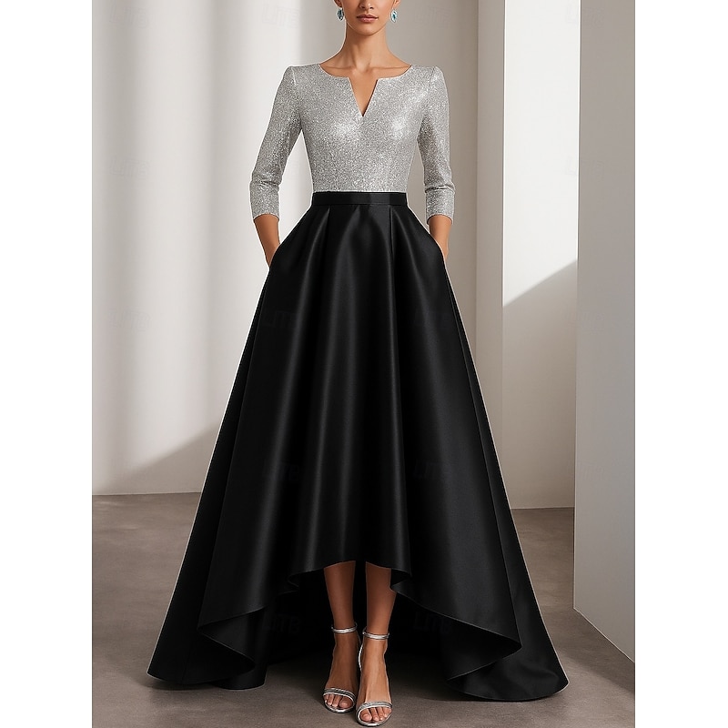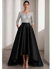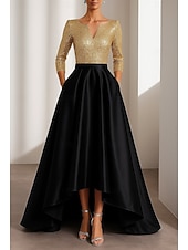 More information about Black Gold A-Line Evening Gown Elegant Formal Dress Formal Wedding Asymmetrical Half Sleeve V Neck Satin with Glitter 2025