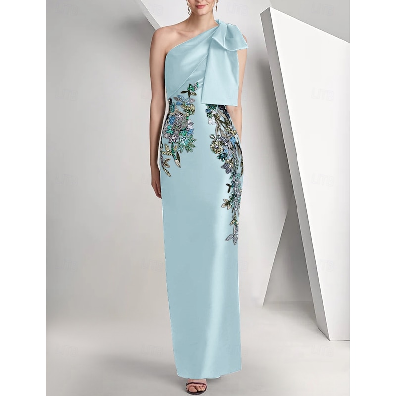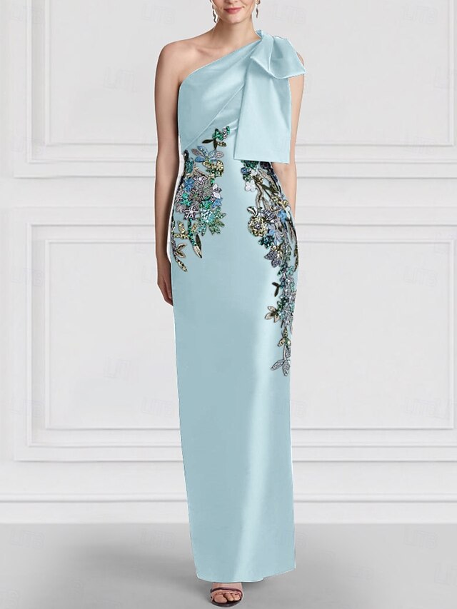 More information about Black Floral Column Evening Gown Elegant Embroidered Dress Formal Wedding Floor Length Sleeveless One Shoulder Satin with Bow(s) Slit