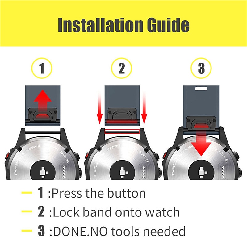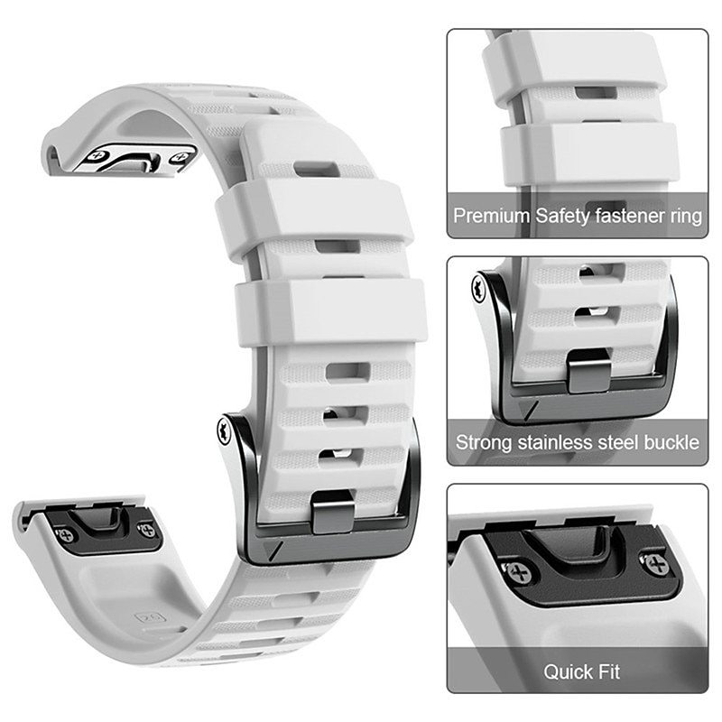 Highlights 1. A trendy and unique two-tone designed watch band that will elevate the style of your watch. 2. The durable connection mechanism of the Fenix 6x watch band comes with a screw bar clasp that holds the band securely in place. Perfect for outdoor sports enthusiasts. 3. The band is suitable for wrist circumferences ranging from 7.08-9.25 inches (180-235mm). It is made of high-quality silicone, adjustable, and flexible to ensure a comfortable fit. 4. The band width is 26mm, and it is compatible with various smartwatch models such as Fenix 6X, Fenix 6X Pro, Fenix 5X, Fenix 5X Plus, Fenix 3, Fenix 3 HR, D2 Bravo, D2 Delta PX, and D2 Charlie smartwatches. Please check your watch model and the compatible models we listed if you're unsure about the size.