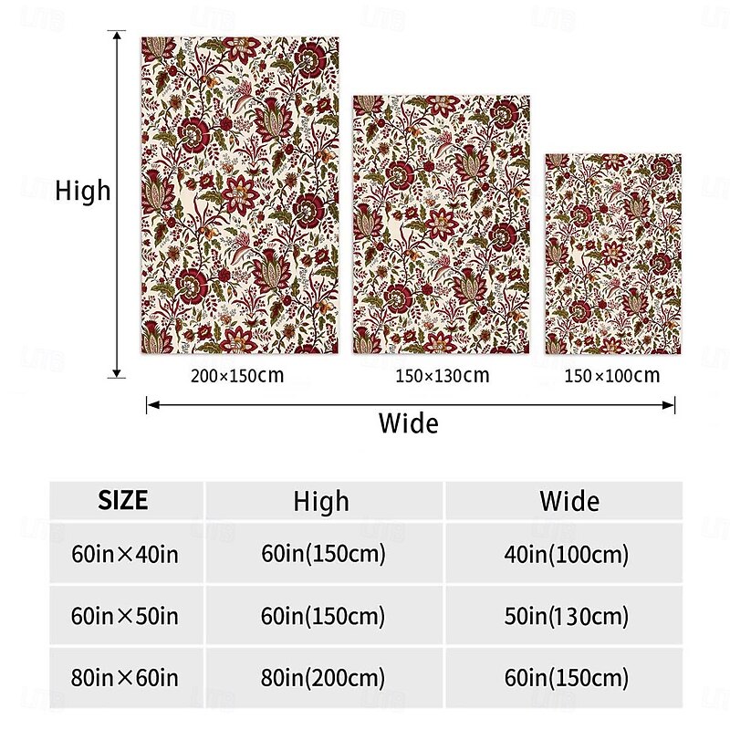 Highlights [Fabric] : Crafted from high-quality flannel polyester blend, this blanket offers a plush, cozy feel that is both warm and gentle against the skin. The luxurious fabric is perfect for providing comfort and relaxation throughout the year. [Design] : The vibrant retro floral patterns feature large, bold flowers in shades of red, pink, and green set against a soothing cream backdrop. The intricate prints are realized using advanced 3D printing techniques, ensuring vivid and lasting colors that bring a touch of nature into your living space. [Design Highlights] : The blanket showcases neat and durable edging, enhancing its longevity and giving it a polished, refined look. Its thick and comfy texture makes it an inviting choice for any home, adding botanical charm and classic design elements. [Occasions] : Ideal for use in various settings, from draping over your sofa or bed to using it as a cozy office nap blanket. This versatile blanket adds warmth and a fashionable flourish to any room, making it a great choice for both children and adults alike. [Size Range] : Available in a variety of generous sizes including 100 x 150 cm (39 x 59 in), 130 x 150 cm (51 x 59 in), and 150 x 200 cm (59 x 79 in), ensuring the perfect fit for your needs, whether as a cozy throw or a full coverage blanket. Perfect for everyday use. top-grade materials and excellent craftsmanship ensure long-lasting durability.