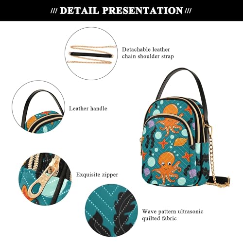 HOT ! Women's Shoulder Handbag Octopuses Playful Sea Animal Quilted Phone Wallet Chain Strap Purse Cute Zipper Crossbody Bowler Bag, 5.9" × 8.3" × 3.1"