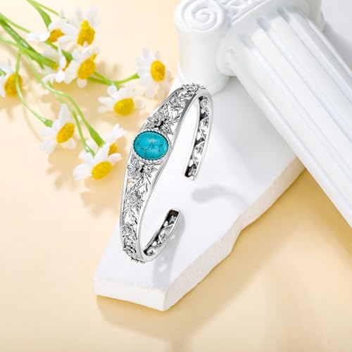 HOT ! Genuine Turquoise Vintage Flower Bracelet Bangle, Sterling Silver Boho Adjustable Bangle Cuff Native American Jewelry for Women, Fit for 6.5 7 7.5 Inches