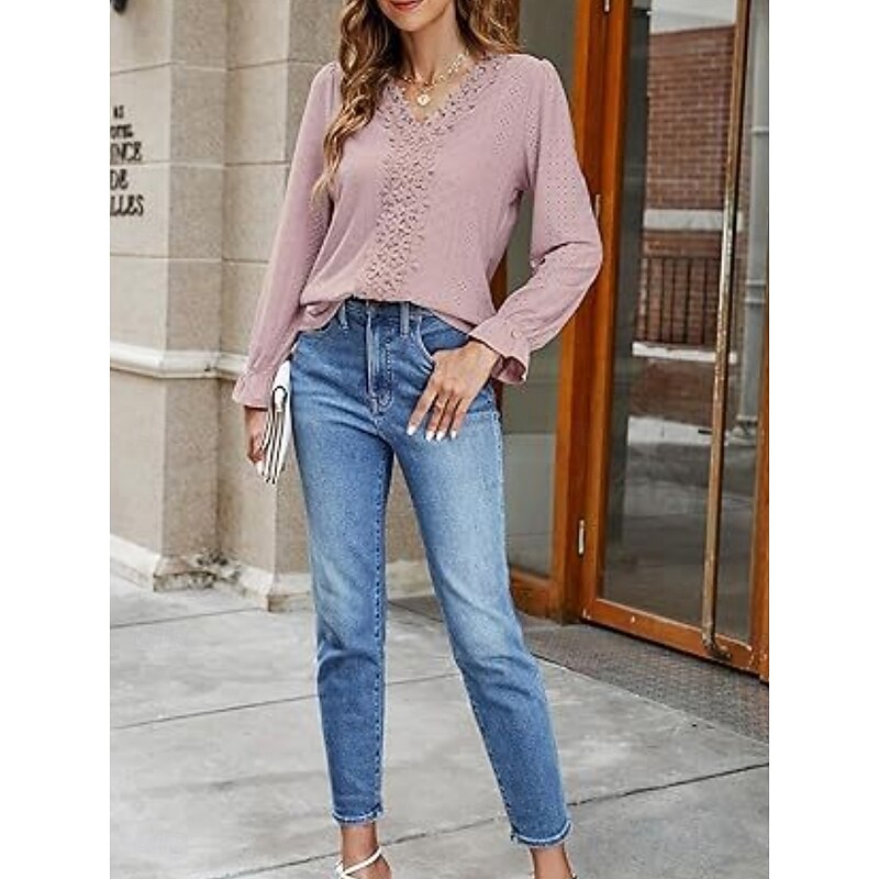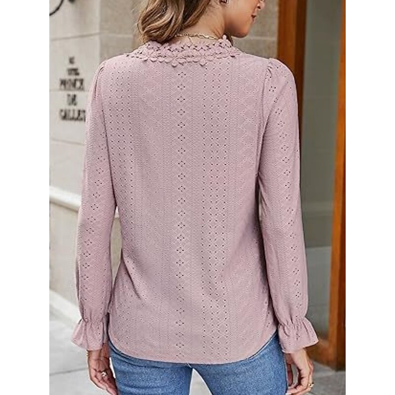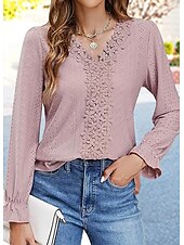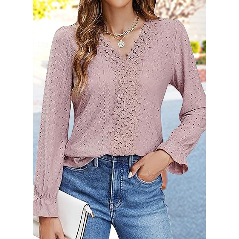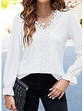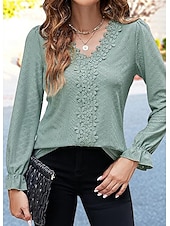 More information about Women's Shirt Blouse Solid Color Basic Casual Long Sleeve V Neck Regular Tops Daily Lace Patchwork White Pink Green Spring Fall