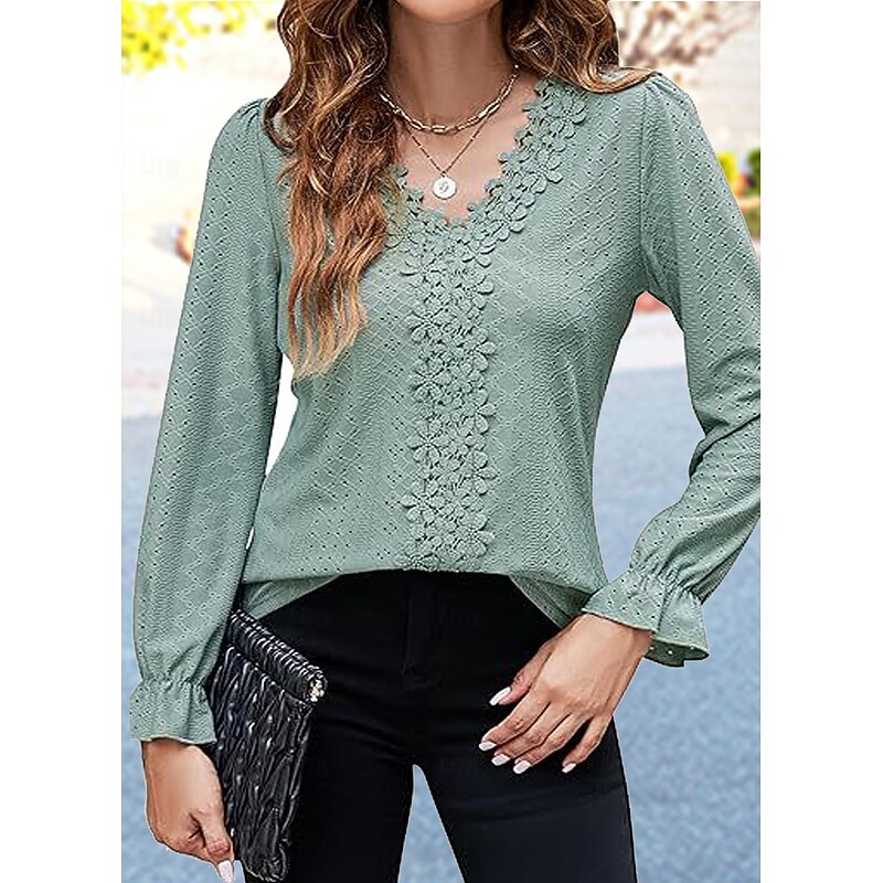 HOT ! Women's Shirt Blouse Solid Color Basic Casual Long Sleeve V Neck Regular Tops Daily Lace Patchwork White Pink Green Spring Fall
