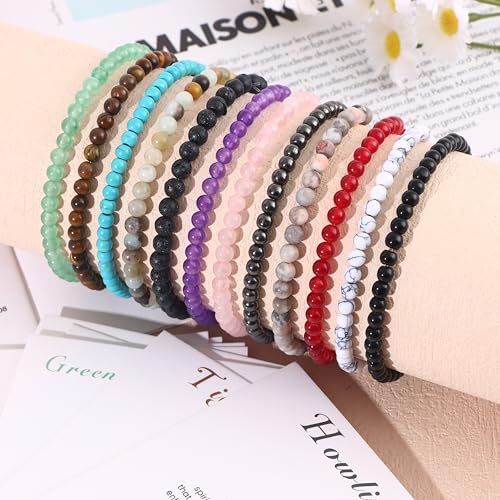 • Natural Stone Bracelet Set: 12 different 4 mm round bead bracelets and colorful message cards in one bag; Including turquoise bracelet, amazonite bracelet, tiger eye bracelet, amethyst bracelet, lava rock bracelet, rose quartz bracelet and obsidian bracelet and so on; Each crystal bracelet for women has a special spirituality, bringing you different energy