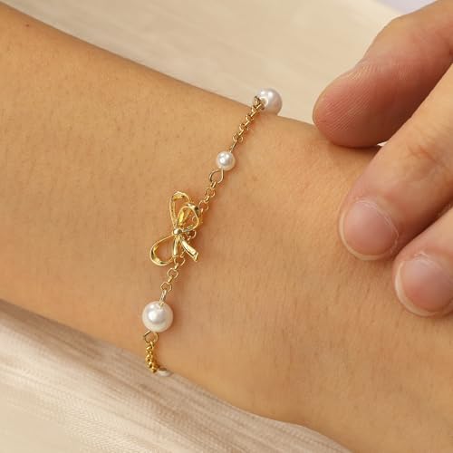 • 🎀PERFECT JEWELRY GIFT🎀The trendy gold pearl bowknot chain bracelet is an ideal gift for any occasion. Whether it's Valentine's Day, Mother's Day, a birthday, or Christmas, this gold bowknot bracelet adds a special touch of surprise and warmth to your gift. The exquisite design and high-quality materials reflect the giver's thoughtfulness and taste, making the recipient feel cherished and loved.