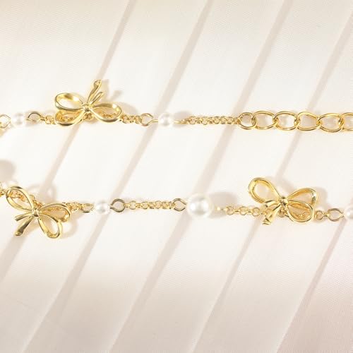 Gold Bow Knot Link Bracelet for Women with Pearl Cute 14K Gold Plated Bowknot Bracelet Elegant Bow Charm Bracelet Dainty Bow Tie Ribbon Bracelet Summer Party Trendy Jewelry Gift for Women 5