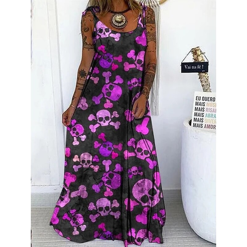 Halloween Women's Skulls Print Maxi Dress Summer Dress Slip Dress Casual Daily Regular Fit Skull Sleeveless U Neck Black White Red Purple Summer 13