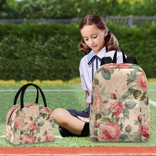 Bookbag Lunch Box Set Camping Backpack Waterproof, Backpacks Set for Girls, Vintage Pink Roses 5