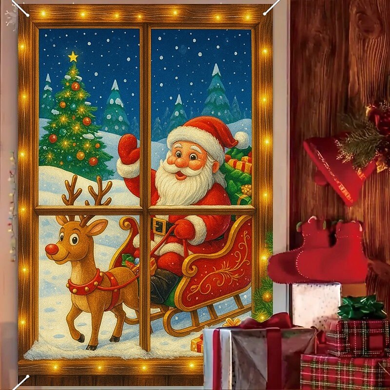 HOT ! Christmas Santa with Reindeer Curtain, 2025 Xmas Festive Window Curtain Door Cover for Holiday Home Decor, Kids Room, Party Hanging Tapestry