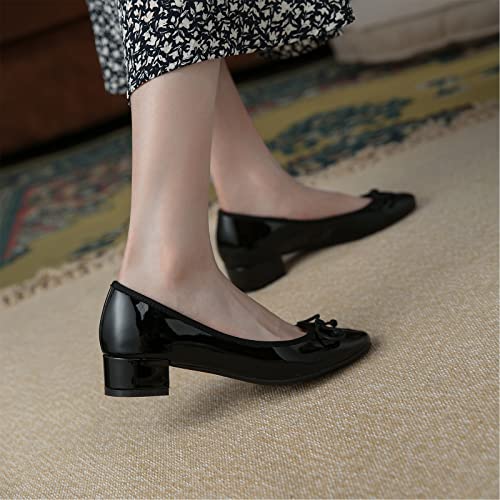 Lutalica W Women's Classic Closed Round Toe Patent Leather Comfortable Daily Slip On Bow Tie Low Chunky Heel Pumps Shoes Black Size 12 7