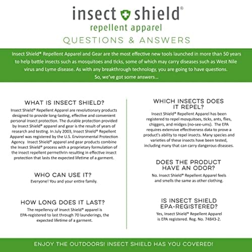 • BUILT-IN INSECT REPELLENT: The fabric is tested and proven to repel mosquitoes, ants, flies, ticks, chiggers and midges (no-see-um); Invisible, odorless insect repellent clothes with no restrictions for use; Active ingredient: permethrin 0.52%