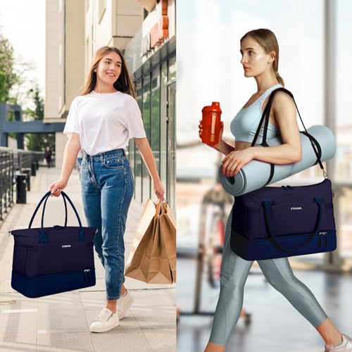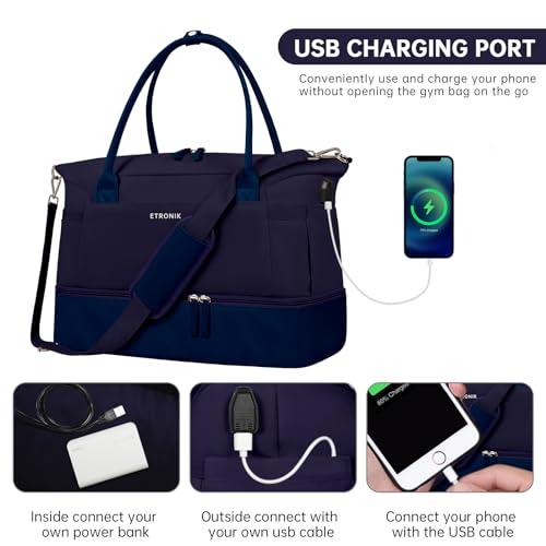 ETRONIK Weekender Bags for Women, Canvas Travel Bag 2 Pcs Set with USB Charging Port, Duffle Bag with Shoe Compartment, Carry on Overnight Bag for Women Travel, Dark Blue 5
