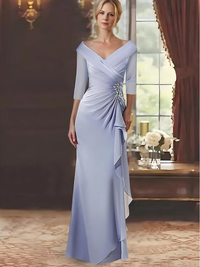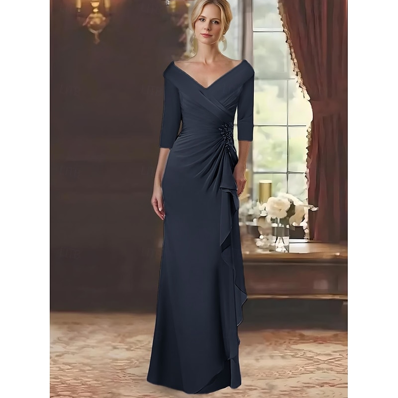 More information about A-Line Mother of the Bride Dress Elegant V Neck Floor Length Chiffon Lace Long Sleeve with Cascading Ruffles
