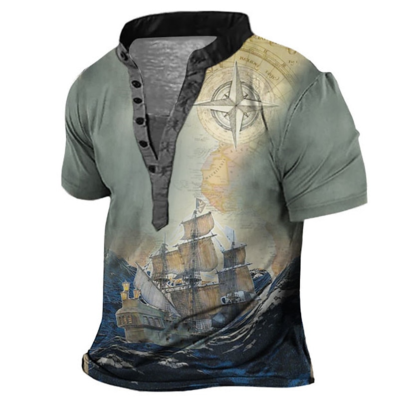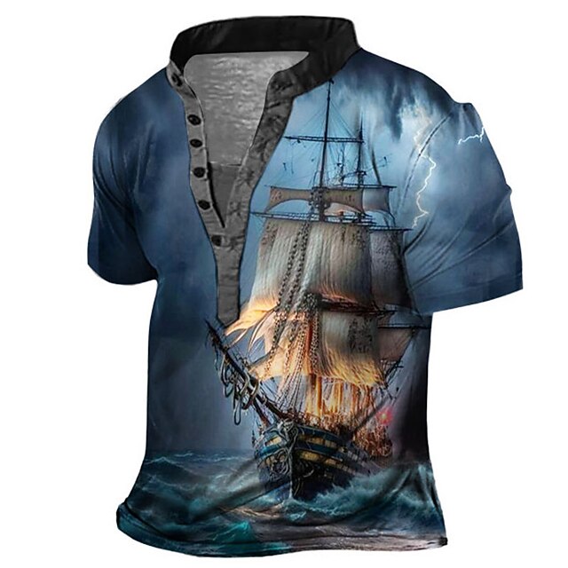 Men's Graphic Ship Henley Shirt Short Sleeve 3D Print Fashion Casual Comfortable Outdoor Daily Going out Summer Dark Brown Pink Red Navy Blue Blue Henley Henley T-Shirt 22