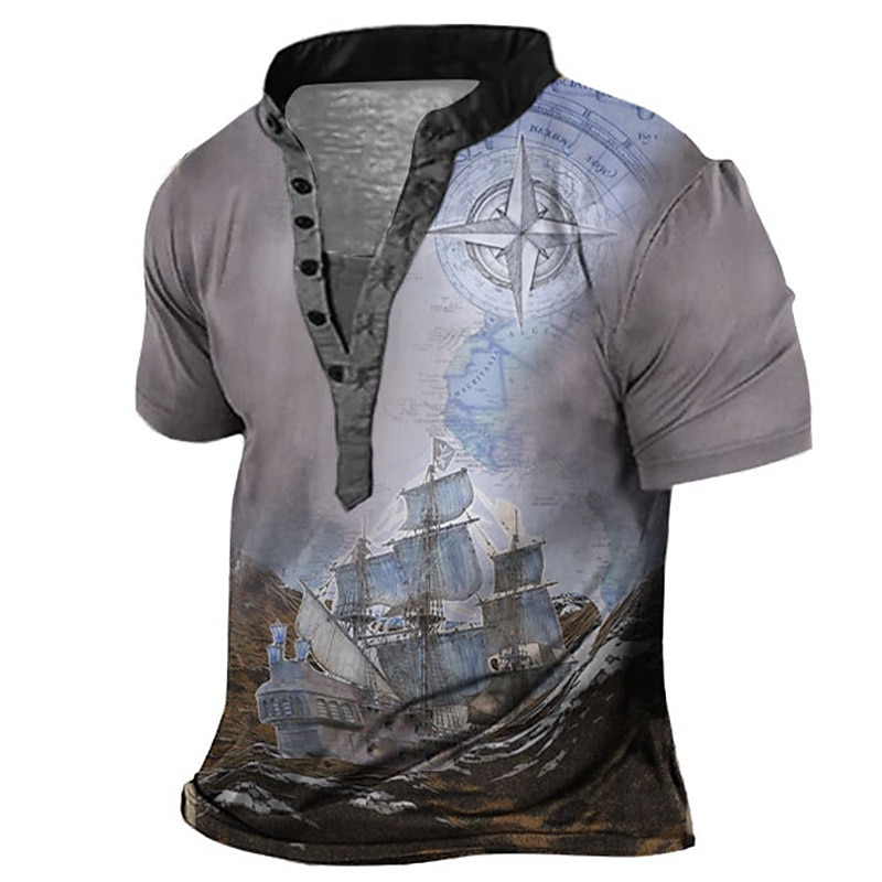 Men's Graphic Ship Henley Shirt Short Sleeve 3D Print Fashion Casual Comfortable Outdoor Daily Going out Summer Dark Brown Pink Red Navy Blue Blue Henley Henley T-Shirt 23