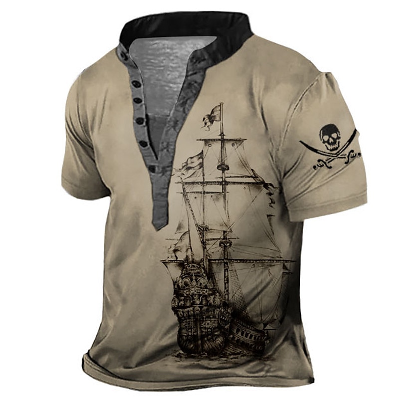 Men's Graphic Ship Henley Shirt Short Sleeve 3D Print Fashion Casual Comfortable Outdoor Daily Going out Summer Dark Brown Pink Red Navy Blue Blue Henley Henley T-Shirt 7