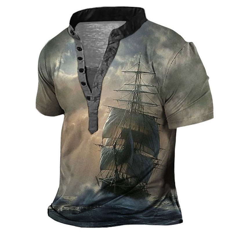 Men's Graphic Ship Henley Shirt Short Sleeve 3D Print Fashion Casual Comfortable Outdoor Daily Going out Summer Dark Brown Pink Red Navy Blue Blue Henley Henley T-Shirt 24