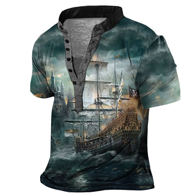 Men's Graphic Ship Henley Shirt Short Sleeve 3D Print Fashion Casual Comfortable Outdoor Daily Going out Summer Dark Brown Pink Red Navy Blue Blue Henley Henley T-Shirt 27