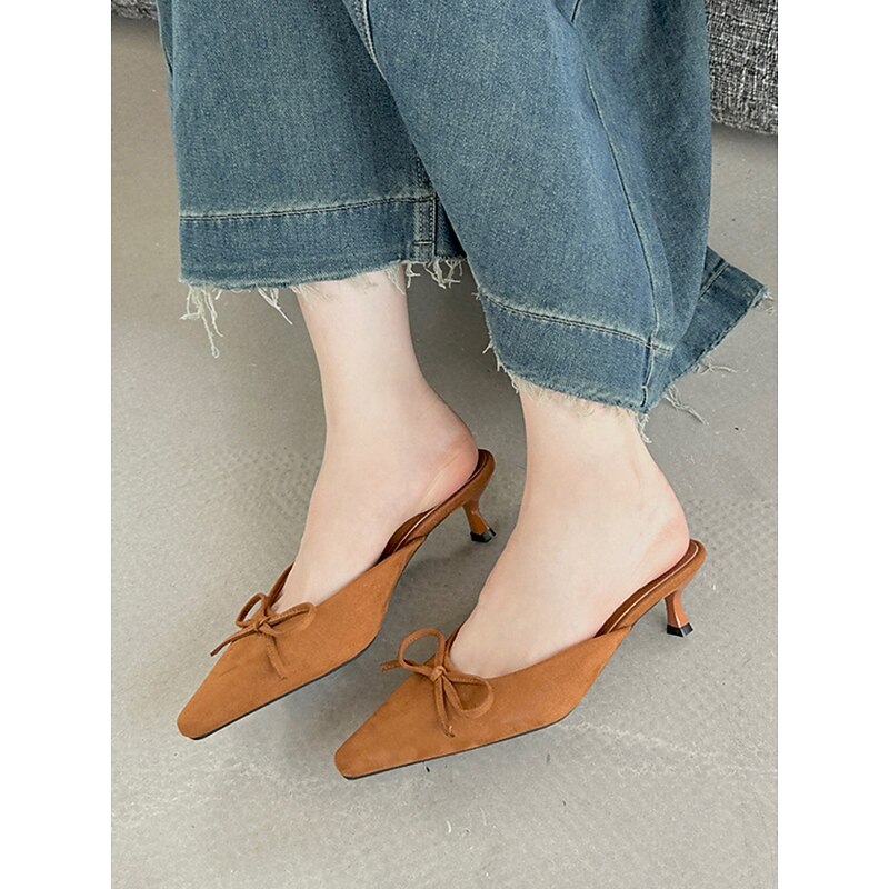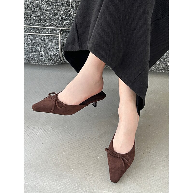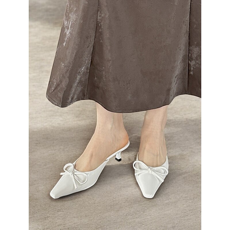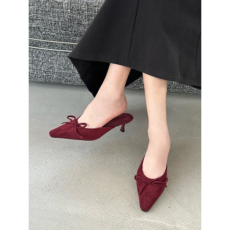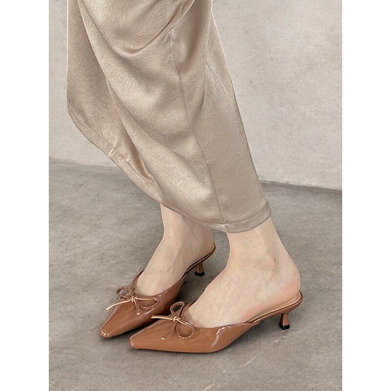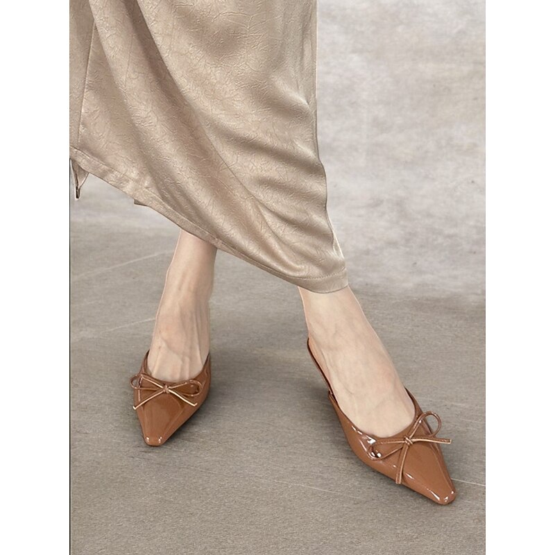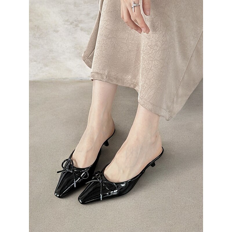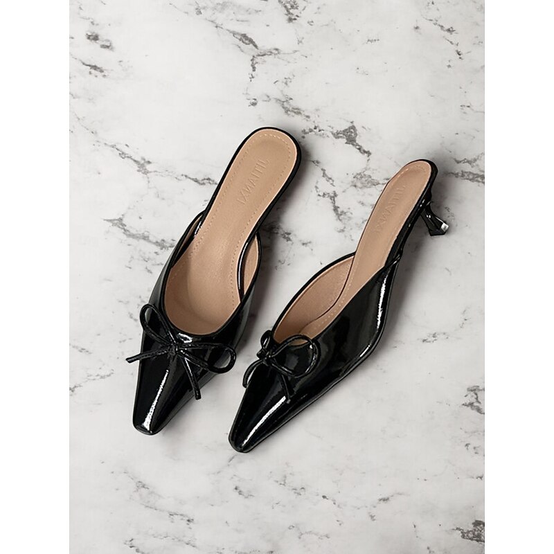 Highlights [Fabric] Crafted from high-quality faux leather, these women's mules showcase a glossy burgundy patent finish that exudes both elegance and modernity. The exquisite material ensures a stylish and sophisticated appearance suitable for various occasions. [Fit] Featuring a pointed toe and low kitten heel, these mules combine style and practicality. The slip-on design offers convenience and ease of wear, making them an excellent addition to any wardrobe that seeks both comfort and elegance. [Design Highlights] The mules are adorned with a delicate bow detail on the upper, adding a touch of femininity and charm. The pointed toe design enhances their chic and modern aesthetic, making them a standout choice for fashion-forward individuals. [Occasions] Perfect for both daily and semi-formal events, these mules are versatile enough for office settings, casual outings, and business occasions. Their blend of style and practicality makes them a must-have for any fashion-conscious wardrobe. [Size Range] Available in a range of sizes from US5.5 / EU35 / UK3.5 to US9.5-10 / EU41 / UK7.5-8, ensuring a comfortable fit for various foot sizes while adding poise and style to your ensemble.