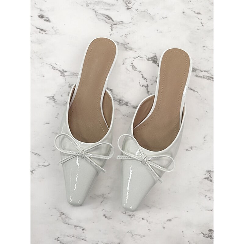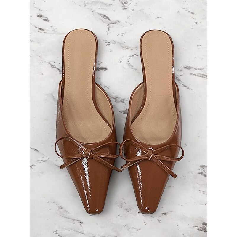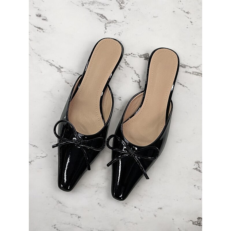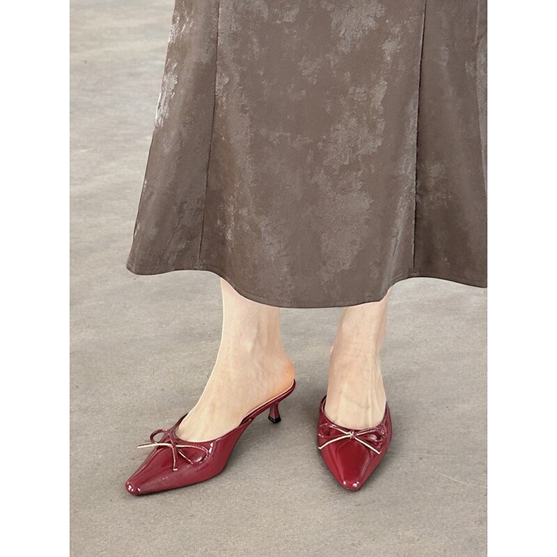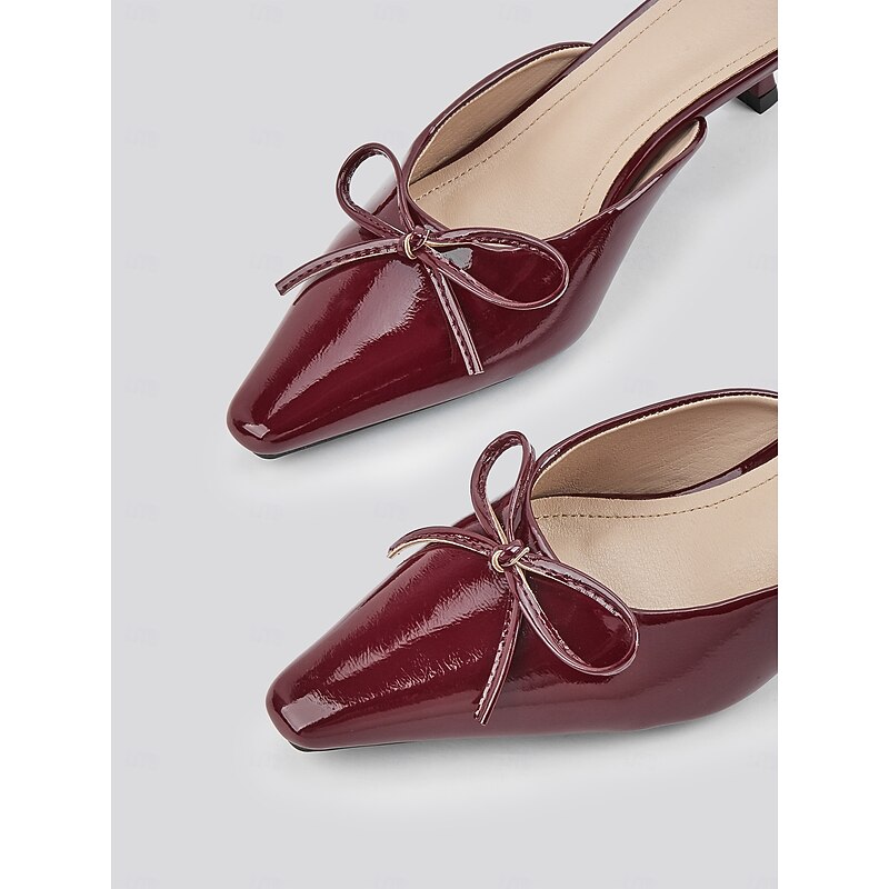 HOT ! Women's Burgundy Patent Faux Leather Mules with Bow Detail - Chic Slip-On Heels with Pointed Toe for Elegant Outfits