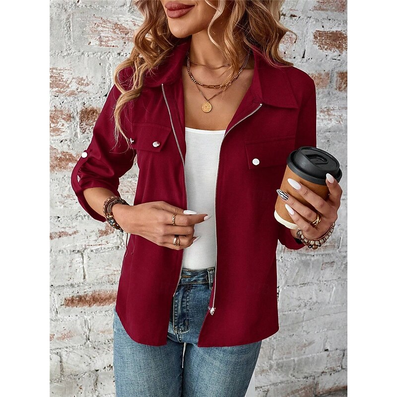 HOT ! Women's Winter Coat Outdoor Street Daily Wear Fall Winter Short Coat Regular Fit Thermal Warm Breathable Stylish Casual Jacket Long Sleeve Plain with Pockets Full Zip Black Wine