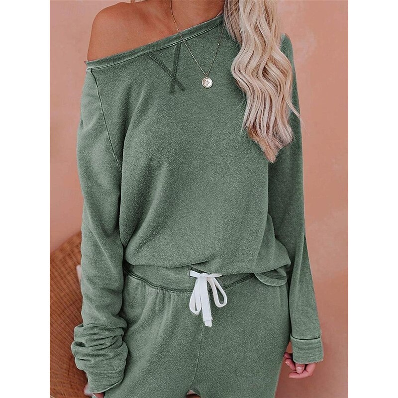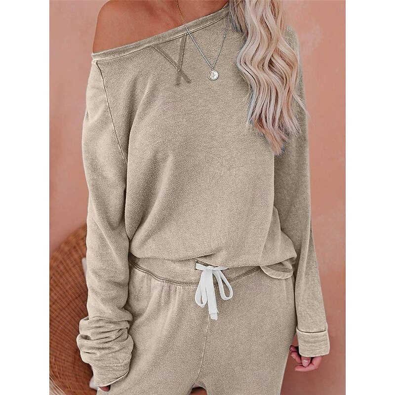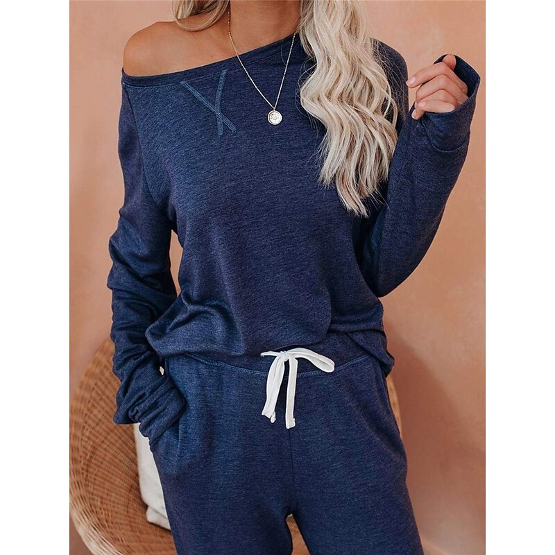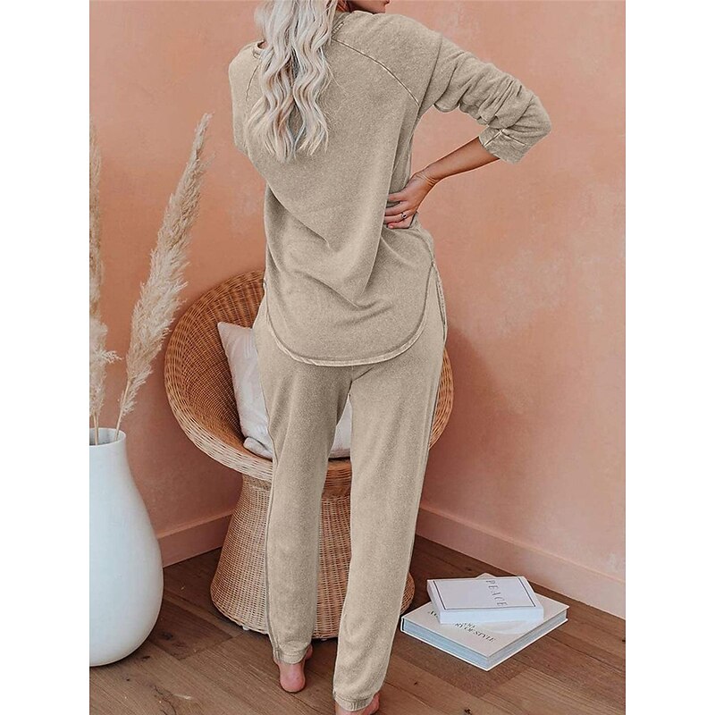 Highlights [Fabric] Crafted from high-quality polyester, this women's pajama set offers a soft, breathable experience perfect for fall and winter. The micro-elastic material ensures comfort while maintaining a sleek appearance. [Fit] The set features a relaxed fit that combines ease of movement with a contemporary silhouette. The top includes a classic crew neck and long sleeves, while the jogger pants are designed with a tapered leg and an elastic waistband for a snug fit. [Design Highlights] This set showcases thoughtful details, including a ribbed hem and cuffs on the top for added texture, and functional side pockets on the jogger pants. The elastic waist with a drawstring ensures a customizable fit, making it both stylish and practical for daily wear. [Occasions] Ideal for various home-related activities, these pajamas are perfect for daily lounging, sleeping, or tending to home tasks. Their simple yet stylish design makes them suitable for wearing at home throughout the fall and winter seasons. [Size Range] Available in sizes S, M, L, XL, and 2XL, catering to a wide range of body types for a comfortable, personalized fit. The set offers options in several colors, including blue, green, gray, and khaki, to suit different style preferences.
