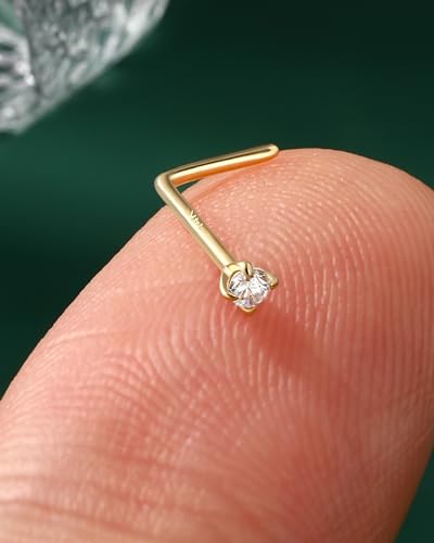 COCHARM 14K Solid Gold Bone L Bend Nose Stud 22g 18g 20g 1.5mm 2mm 3mm CZ Yellow Gold Nose Ring Stud Press Fit Nose Pin S Screw 14K Real Gold Nose Piercing 22g 20g 18g Nose Jewelry 5