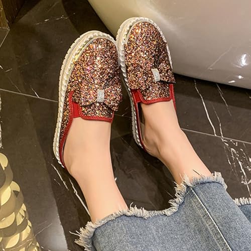 Women Sparkly Rhinestone Slip On Flats Bowknot Thicken Bottom Flats Round Toe Stitch Platform Fashion Casual Shoes 6