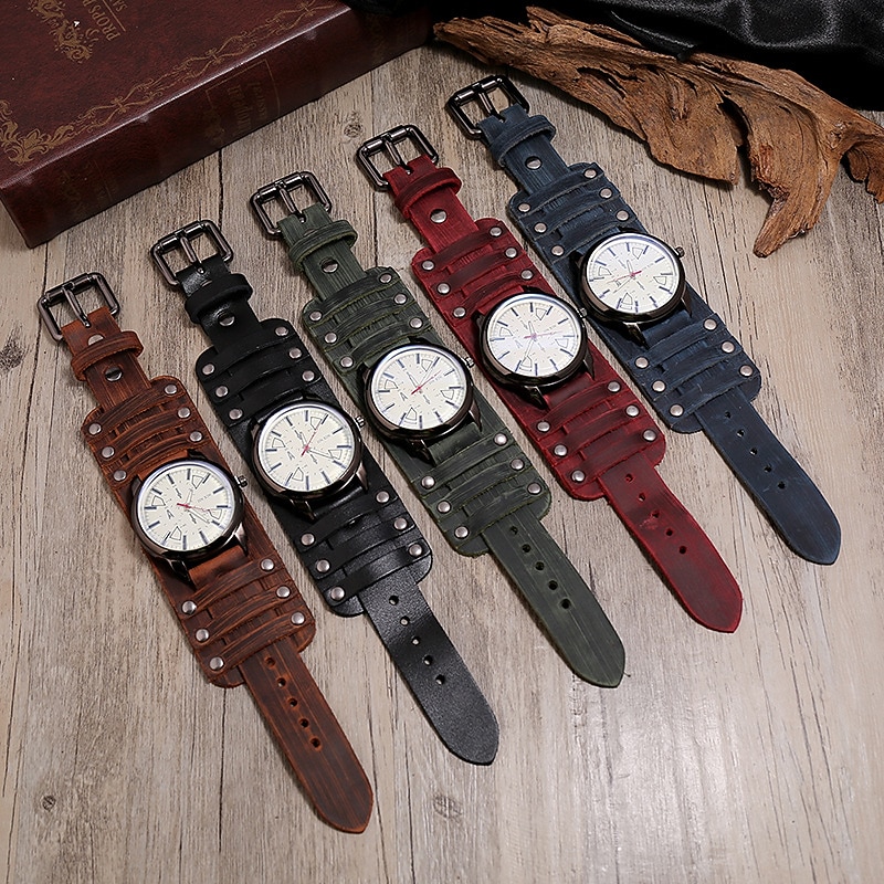 A3850 Punk Vintage Hand Stitched Cowhide Large Dial Watch Hip Hop Men's Leather Bracelet Wat 1