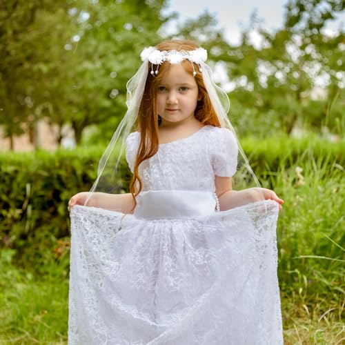 First Holy Communion Veil for Girls Catholic, White Pearl Flower Girl Veils Lace First Communion Headpiece for Girls 7