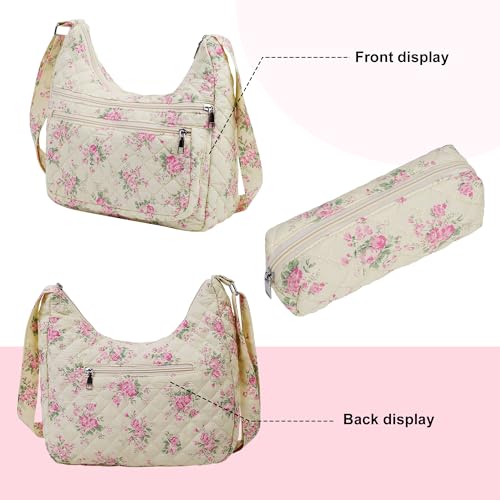 2-Piece Set Women's Small Floral Quilted Crossbody Bag and Tote, Multi-Pocket Shoulder Handbags for Everyday Use, Travel 5