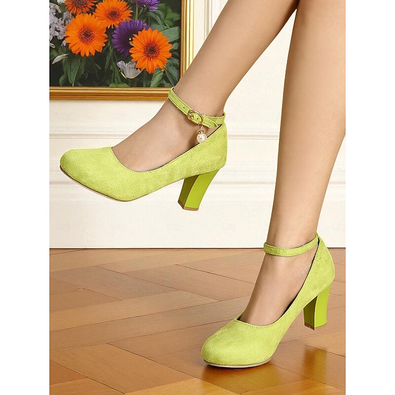 Women's Yellow Suede Block Heel Pumps with Ankle Strap and Pearl Charm - 1950s Elegant Vintage Retro Dress Shoes for Weddings, Cocktail Parties & Evening Wear 8