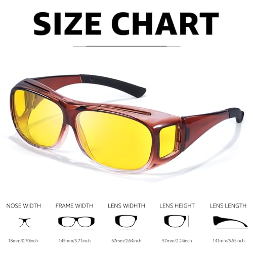 • Fit Over Glasses: These night driving glasses for men are designed to comfortably fit over prescription eyeglasses of various types and degrees. Whether you have high myopia or farsightedness, simply wear them directly over your existing glasses without any need for modification.